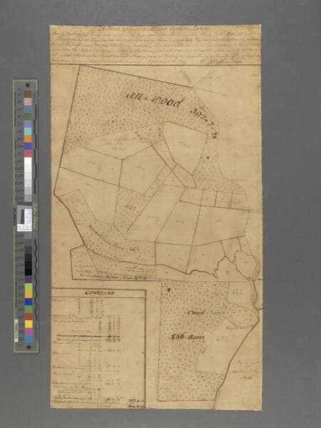 Autograph document signed. Pen and ink with colored boundary lines; with table. Scale: 1 inch = 40 poles. (1 page)
