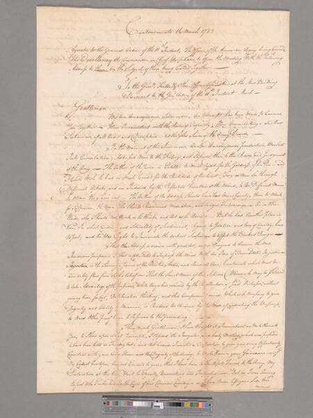 Contemporary copy. Address regarding anonymous "Newburgh Letters." Place name not given on manuscript. (3 pages) On reverse of page 3: proceedings of the meeting of the officers of the American Army, following the withdrawal of his excellency, General Washington. (1 page)