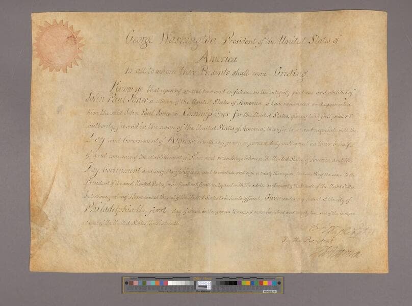 Document signed (printed form, filled in). Filled in text in hand of Washington, signed by John Hancock.