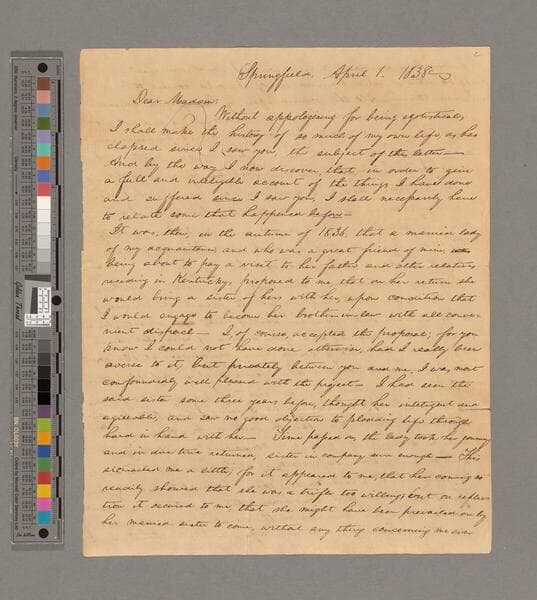Autograph letter signed. Letter regarding Lincoln's failed courtship with Mary S. Owens. Includes addressed cover, addressed to Mrs. O.H. Browning. (5 pages)