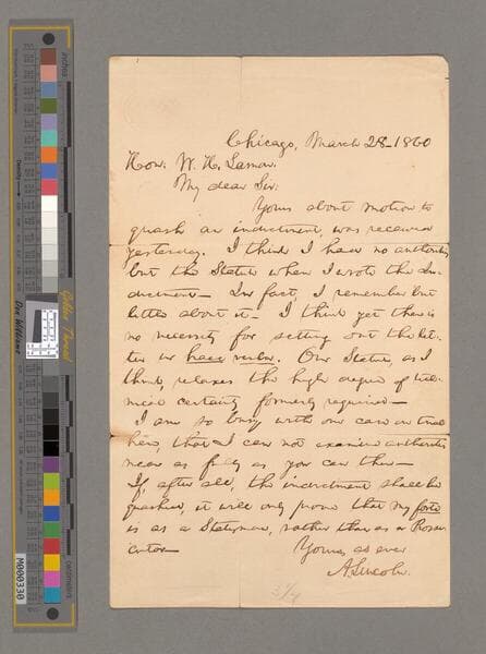 Abraham Lincoln, Chicago, Illinois, letter to Ward Hill Lamon