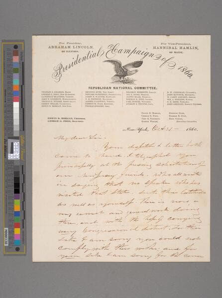 Autograph letter signed. Letter written on "Presidential Campaign of 1860" letterhead. (2 pages)