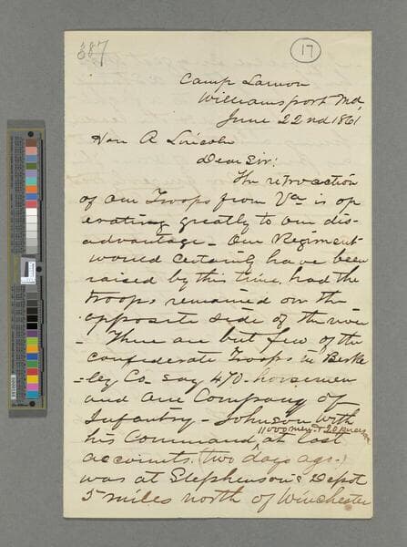 Ward Hill Lamon, Camp Lamon, Williamsport, Maryland, letter to Abraham Lincoln