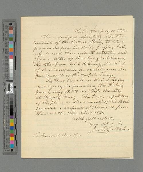 John S. Gallaher, Washington, D.C., letter to Abraham Lincoln