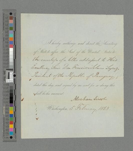 Document signed. Authorizing the Secretary of State to affix the Seal of the United States to the envelope of a letter to Francisco Solana López, President of Paraguay. Printed form, filled in. (1 page)