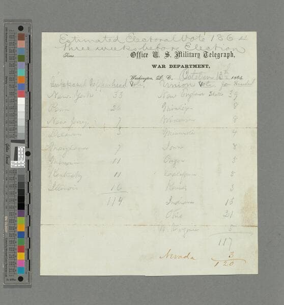 Typescript document signed. Eckert certifies to the authenticity of Abraham Lincoln electoral votes estimate, 1864 October 13 (mssHM 2032). Volume contains copies of engravings and photographs and portions of "Lincoln in the telegraph office : recollections of the United States Military Telegraph Corps during the Civil War," by David Homer Bates. Also present is a facsimile of mssHM 2032.