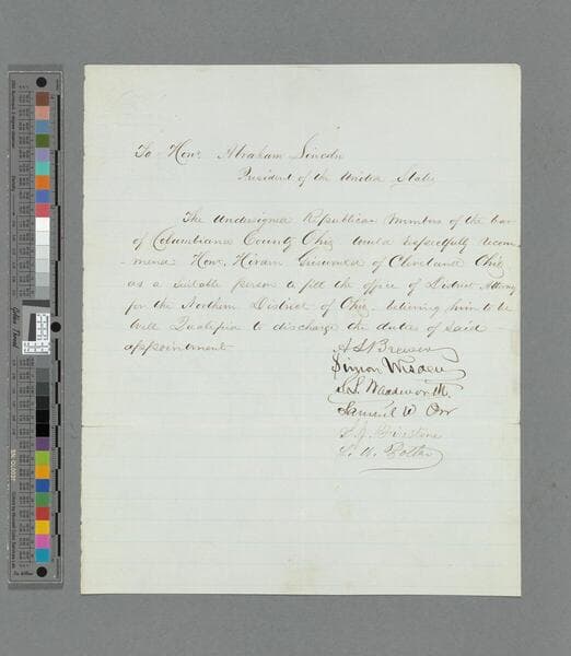 Document signed. Petition from Republican members of the bar recommending Hiram Griswold as District Attorney for the Northern District of Ohio. Includes six signatures. (1 page)