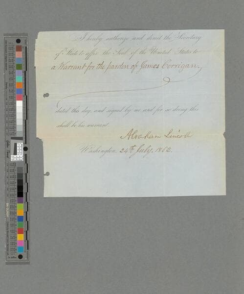 Document signed. Authorizing the Secretary of State to affix the Seal of the United States to a warrant for the pardon of James Corrigan. Printed form, filled in. (1 page)