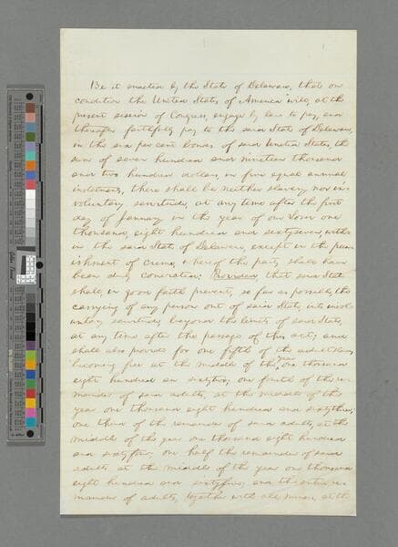 Draft of an act for the gradual emancipation of slaves in the state of Delaware with just compensation to their owners