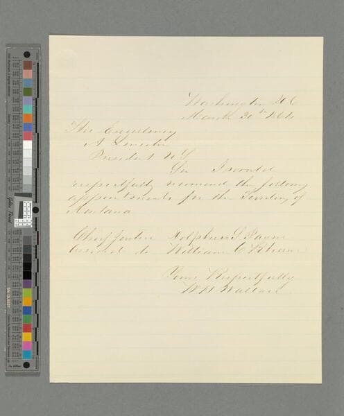 Autograph letter signed. Recommendation for two appointments for the Territory of Montana. Includes envelope endorsed by Lincoln "File. AL. March 31, 1864." (1 page)
