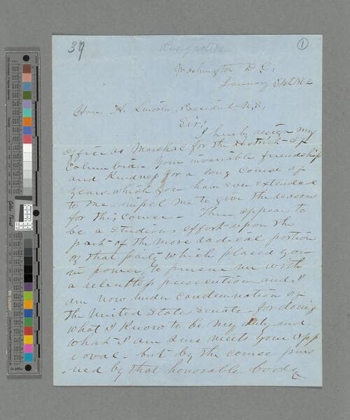 Autograph letter signed (author's copy). Letter submitting resignation from the Office of Marshal for the District of Columbia. (3 pages)