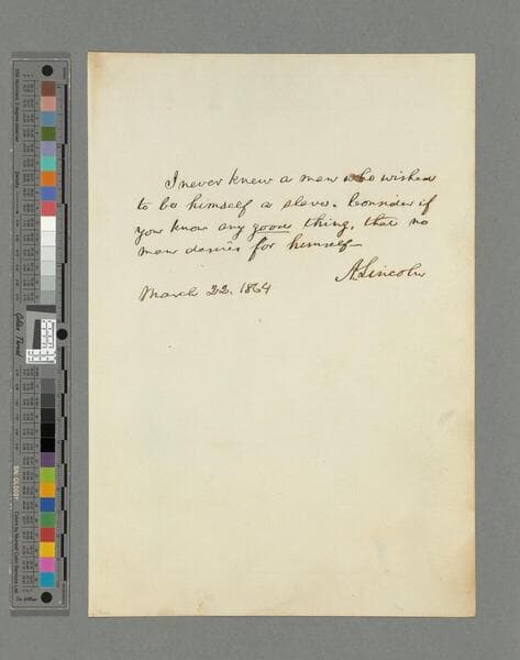 Autograph note signed. Possibly originally written in an autograph for a U.S. Sanitary Commission fair (see note in Collected Works of Abraham Lincoln). (1 page)