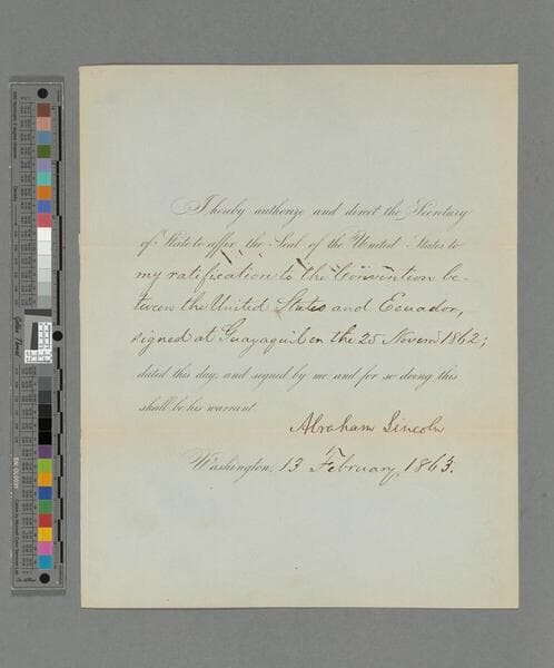 Document signed. Authorizing the Secretary of State to affix the Seal of the United States to Lincoln's ratification to the Convention between the United States and Ecuador, signed 25 November 1862. Printed form, filled in. (1 page)