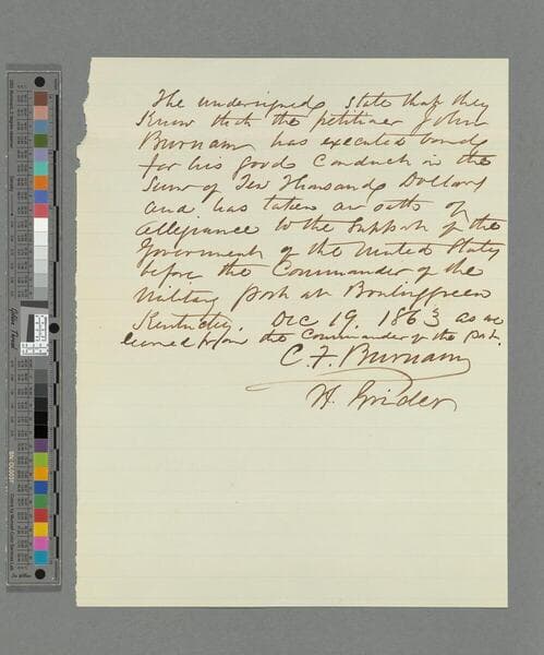 Autograph document signed. Statement that John Burnam has executed bond for $10,000. Also signed by H. Grider. Includes envelope marked "Pardoned by order of the President, Dec 21. 63." (1 page)