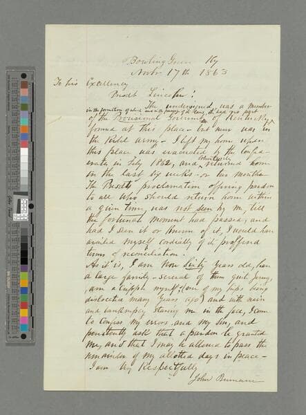 John Burnam, Bowling Green, Kentucky, letter to Abraham Lincoln