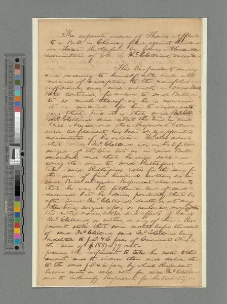 Document signed. The separate answer of Thomas Affleck to a bill in chancery filed against him and Hiram Rutherford by James Alexander, administrator of John H. McClelland, deceased. In hand of Lincoln; followed with a note by the complainant. Date on document is crossed out. (4 pages)