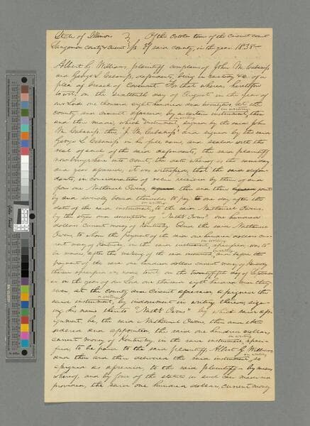 Document signed. Declaration; copy of note sued on. In hand of Lincoln, with signature "Stuart & Lincoln, p.q."