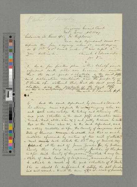 Document signed. Declaration; copy of the instrument declared on, and assignment thereon. In the hand of Abraham Lincoln, with signature "Stuart & Lincoln for Plff."