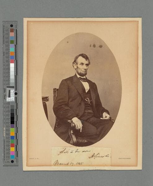 Autograph note signed. Note reads "Let it be done" and is pasted below oval portrait of Lincoln on mount, with imprint "Brady & Co., Photographers." (1 item)
