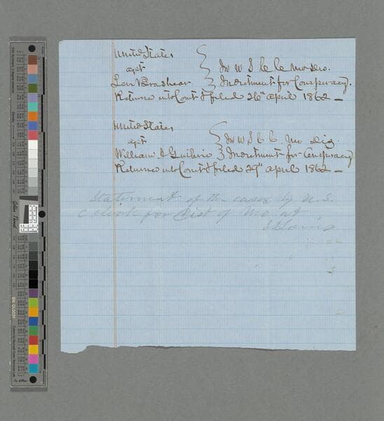 Autograph letter signed. Letter regarding pardon for Levi Brashear and William A. Guthrie. Endorsed by Lincoln: "Attorney General please make out pardons in these two cases. A. Lincoln." Includes a statement of the cases in the United States Circuit Court of Missouri, referred to in the letter, and filing envelope. (3 pages)