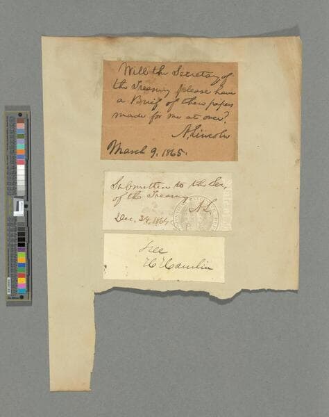 Autograph note signed. Note regarding beef contractors on envelope with endorsements by officers of the Subsistence Office and Colonel A. Beckwith. With endorsement of Lincoln: "Submitted to the War Department, for Commissary General."