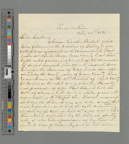 James Britton, Knoxville, Tennessee, letter to Andrew Johnson
