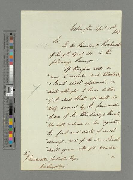 Letter signed. Letter quotes a passage from Lincoln's proclamation of April 19, 1861. (4 pages)