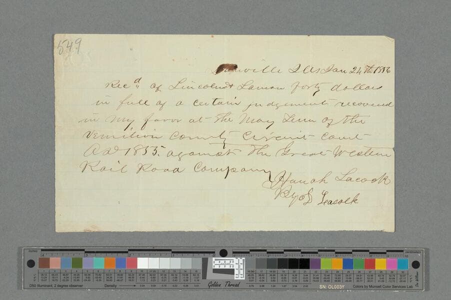 Hanah Lacock, Danville, Illinois, receipt to Lincoln & Lamon