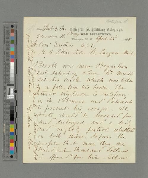 Telegram draft signed. Regarding the pursuit of John Wilkes Booth. (1 page)