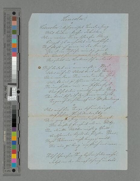 Autograph manuscript. German translation of William Marsh's poem "Lincoln." Includes printed copy of Marsh's poem in English, and a note addressed to "my dear daughter" in English. (3 pages)