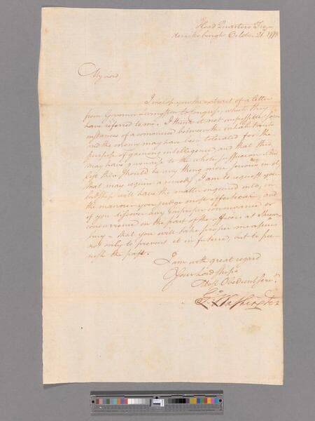 Letter signed, with signed cover (franked). In hand of John Laurens with postscript in hand of Alexander Hamilton. Place name given only as "headquarters." (2 pages)