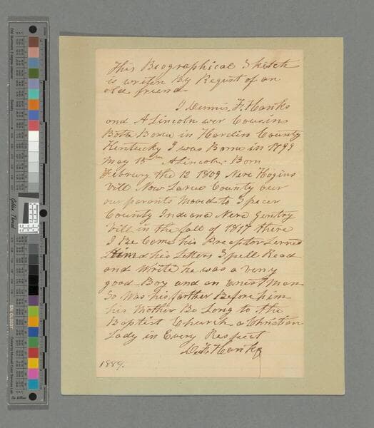 Autograph manuscript signed. Note by Lincoln's cousin, beginning "This Biographical Sketch is written by request of an old friend." With cabinet card photograph of Hanks, 1891. (1 page)