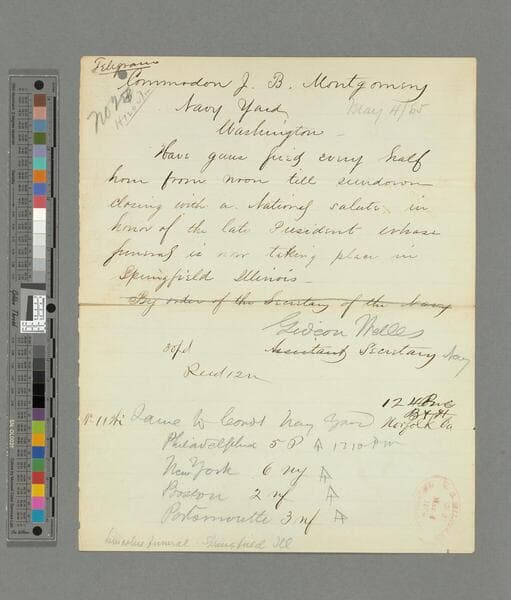 Telegram draft signed. Regarding Lincoln's funeral, signed Gideon Welles in hand of Assistant Secretary Gustavus Vasa Fox. (1 page)