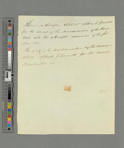 Contemporary copy. Resolution offering reward of $10,000 for the arrest and conviction of the murderer or murderers of the late President of the United States. Certified by John A. Thompson, Register's Office, 1865 May 3.