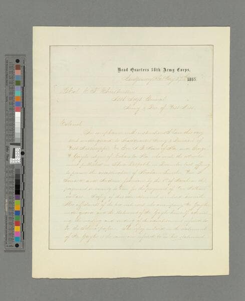 A collection of personal correspondence of Christian T. Christensen, chiefly letters addressed to him. Included are letters received by Christensen on the occasion of his retirement from the Army in June 1865, a few official communications and personal letters received by Christensen during his war service, and a telegram from James T. Holtzclaw negotiating the surrender of Mobile, Alabama (April 1865). The post-war correspondence includes letters from Eunice Ward Beecher and Henry Ward Beecher, Lyman Abbott, William Tecumseh Sherman, and others, chiefly concerning his charity work and Civil War experience. Also included are Christensen's military commissions and other documents, an address entitled "Women's influence" that Christensen delivered at the Working Women's Club on November 10, 1887, and a letter soliciting donations for the Tuskegee Normal and Industrial Institute signed by Booker T. Washington (1904).