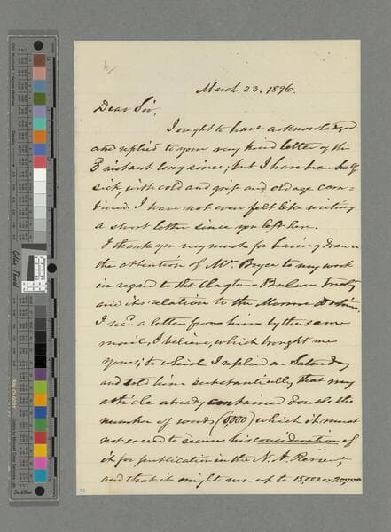 Autograph letter signed. Regarding the authenticity of manuscripts related to Lincoln's plan for compensated emancipation (see HM 3186-HM 3189). (3 pages)