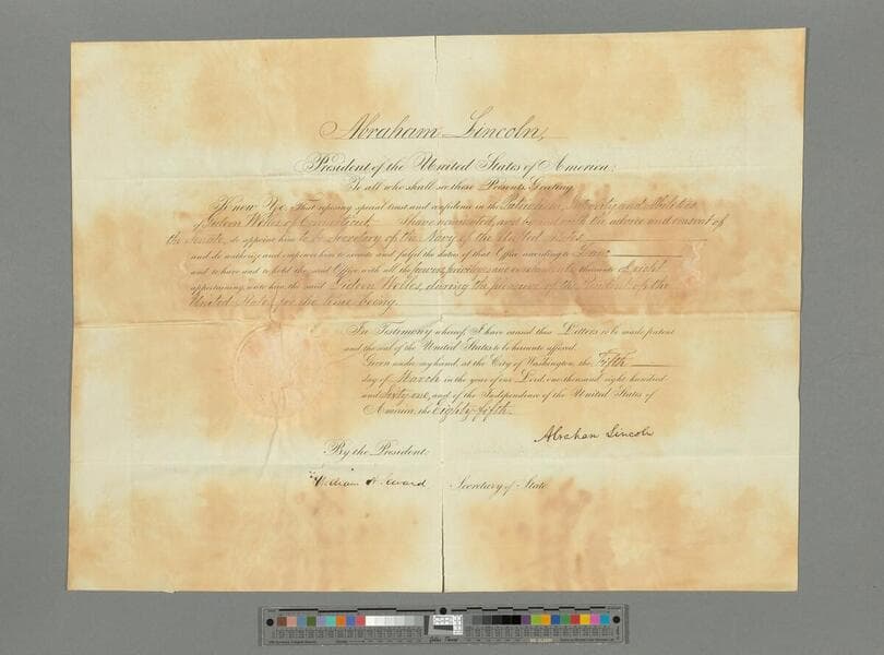 Document signed; printed form, filled in. Signed by Lincoln and Acting Secretary of State Frederick W. Seward.