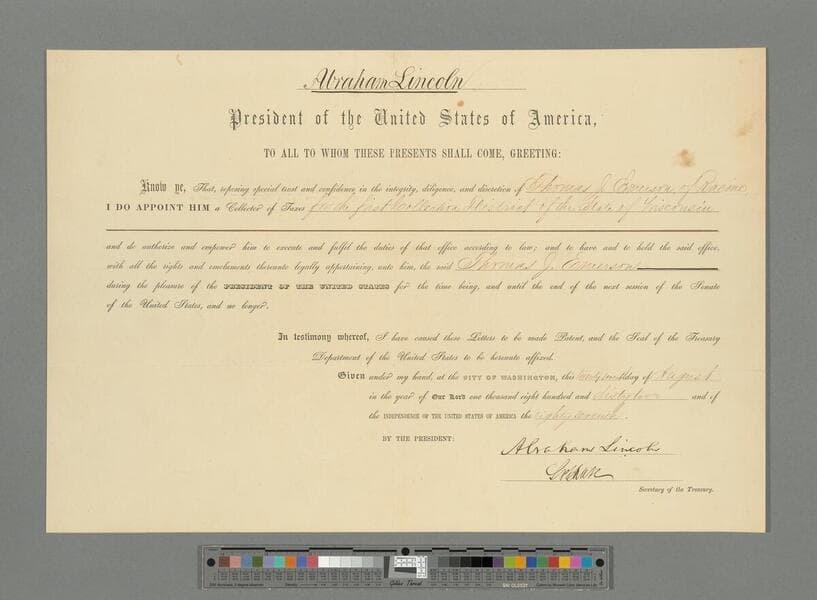 Abraham Lincoln, Washington, D.C., appointment of Thomas Emerson as Collector of Taxes, Wisconsin