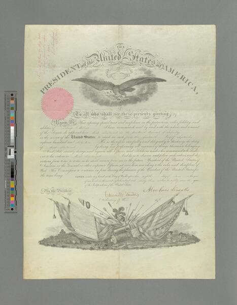 Document signed; printed form, filled in. Signed by Lincoln and Secretary of War Edwin M. Stanton