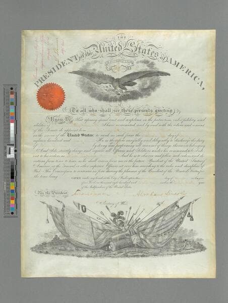 Document signed; printed form, filled in. Signed by Lincoln and Secretary of War Edwin M. Stanton.
