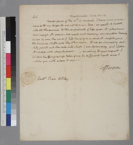 Thomas Jefferson, Monticello, letter to Vine Utley