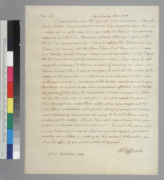 Thomas Jefferson, Monticello, letter to Wilson Cary Nicholas