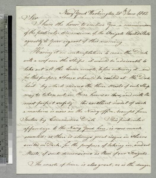 Autograph letter signed, with addressed cover; endorsed by Jefferson. Includes enclosure of dimensions of the frigate United States. (4 pages)