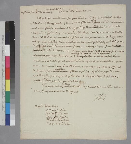 Autograph draft initialed; endorsed by Jefferson. Written on reverse of reused addressed cover. Letter is addressed to John Winn, William C. Rives, Daniel Railey, John M. Railey, John Ormond, Horace Branham, George W. Nicholas. (1 page)