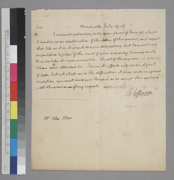 Thomas Jefferson, Monticello, letter to John Meer