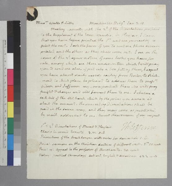Thomas Jefferson, Monticello, letter to Wells & Lilly