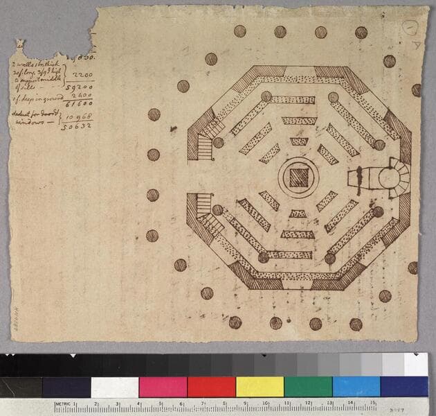 Autograph manuscript, pen and ink. Includes notes. Design for chapel with Temple of Vesta as model. (2 pages)