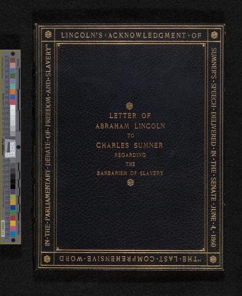 Autograph letter signed. Lincoln acknowledges receipt of a copy of Sumner's speech "The Barbarism of Slavery." Bound with copies of engraved portraits of Sumner and Lincoln and photograph portraits of Sumner, copies of engravings of Sumner family residences, a typescript transcript of the letter, a typed explanation of the letter, and a printed chapter 23 from Life of Charles Sumner. (letter 1 page, other material 28 pages)
