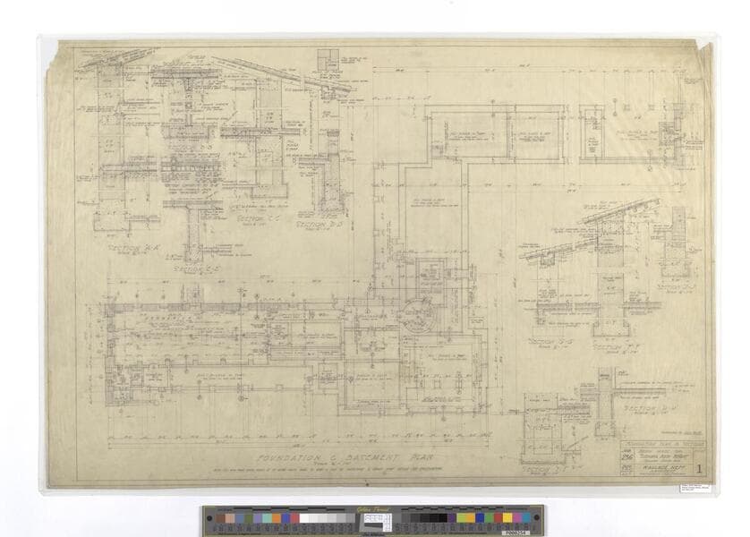 8 drawings: Plot, foundation, basement, and floor plans, elevations, sections, details. 2 drawings dated 1937.