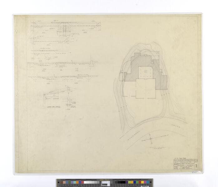 8 drawings: Plot, foundation, basement, and floor plans, elevations, sections, details. 2 drawings dated 1937.